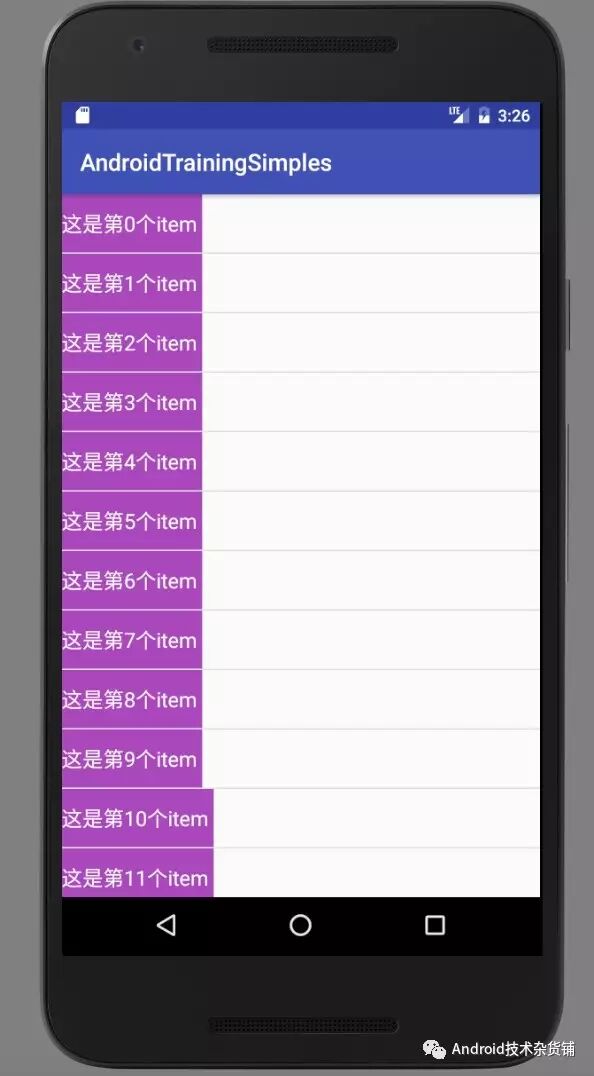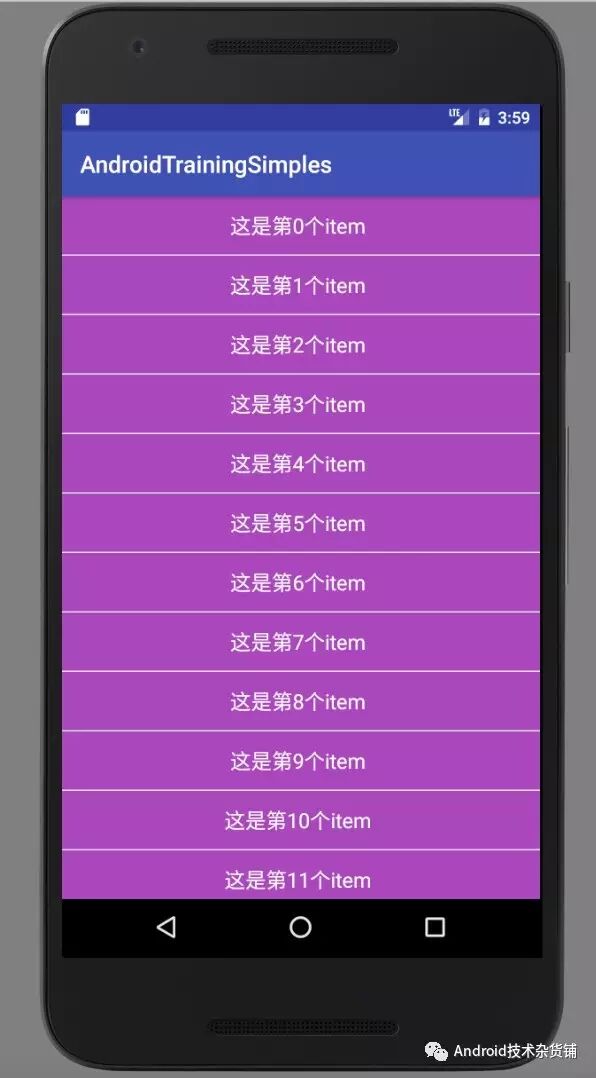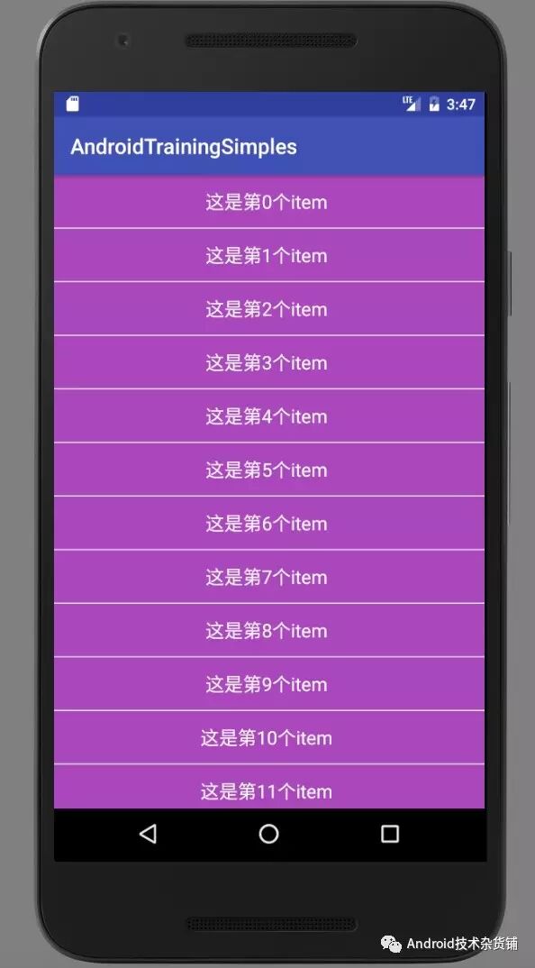 代码很简单,就是一个RecyclerView 显示一个简单的列表,一行显示一个文本。写完代码运行看一下效果: