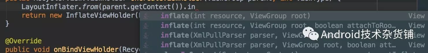 从上图可以看到 inflate 方法有四个重载方法,有两个方法第一个参数接收的是一个布局文件id,另外两个接收的是XmlPullParse,看源码就知道,接收布局文件的inflate方法里面调用的是接收XmlPullParse的方法。