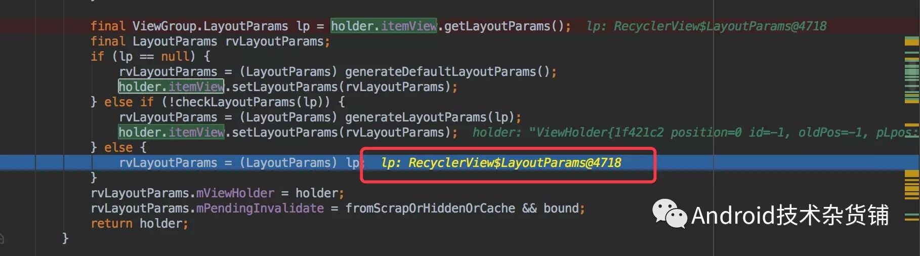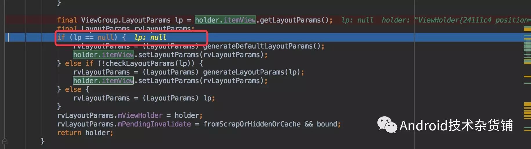 通过断点调试如上图,从itemView 中获取的layoutParams为null,因此会调用generateDefaultLayoutParams方法。因此会生成一个宽高都是wrap_content的LayoutParams,最后导致不管外面的item根布局设置的宽高是多少都会失效。