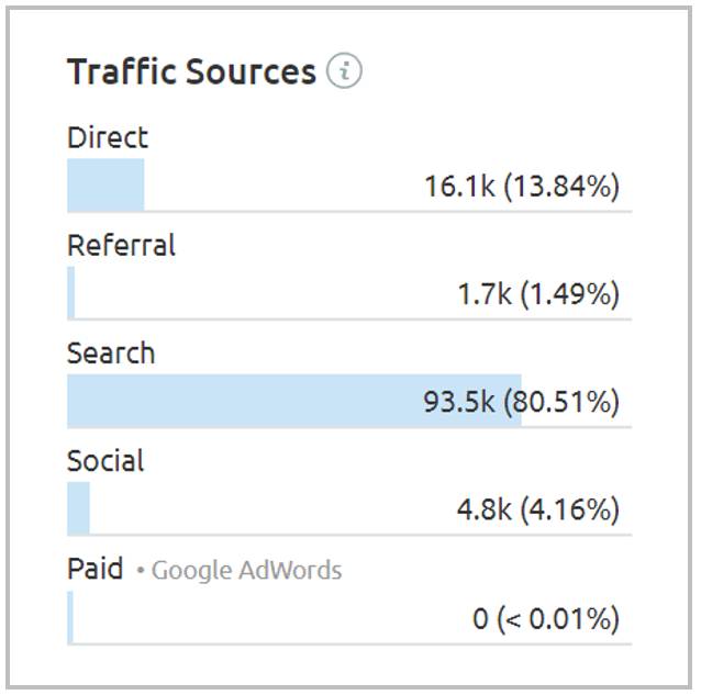 如上图所见,网站流量来源主要为自然搜索(80.51%)。可见网站 SEO 做得不错,自然排名较高,无需特意竞价推广。