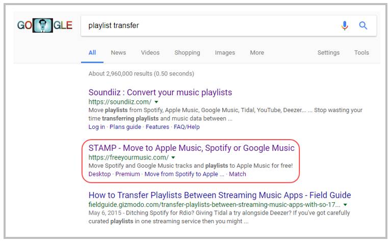 在 Google 上用「playlist transfer」作为关键词搜索,Stamp 排第二位,可见其 SEO 效果已相当优秀。