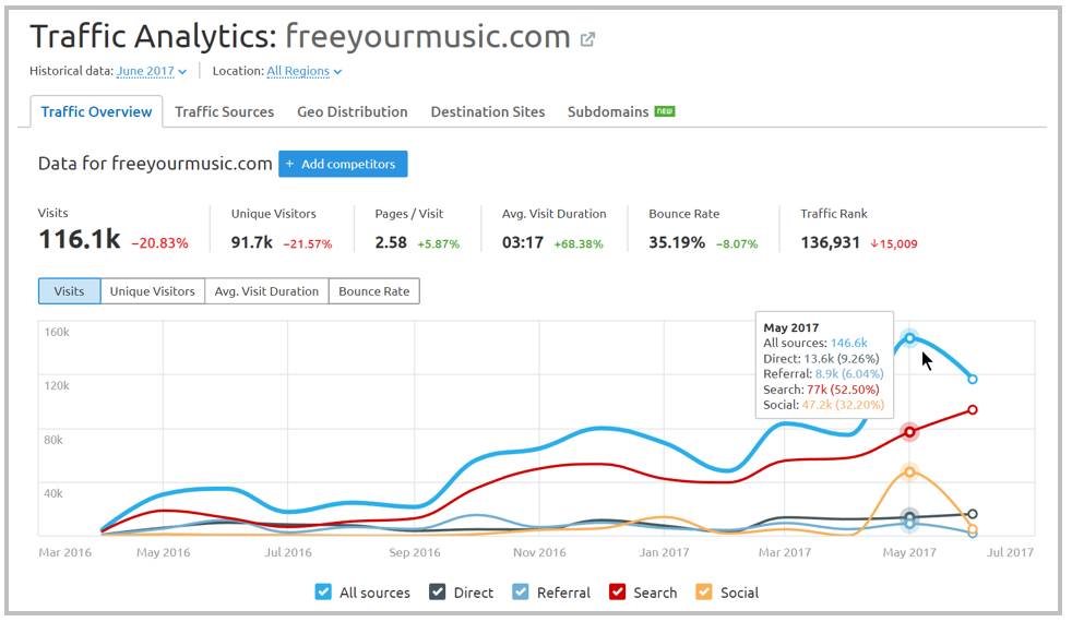 我们来根据网站流量验证下收入。如下图,高峰期(2017年05月)月访问量约14.6万人次,即便当前的低谷时期(2017年06月)月访问量也有11.6万人次。按照网站普遍2%左右转化率来看,月入1.7万美元不难做到(预估收入:¥100 × 2% × 11.6万人次 ≈ ¥23.2万 ≈ $3.4万)。