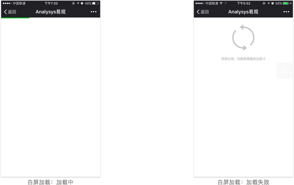 多出现在H5页面中,特点是一次性加载完所有数据,界面单一。若加载失败,页面为空。