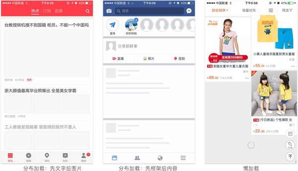1.分步加载:优先加载占网络资源较小的元素,如先文字和默认图标后图片,图片加载完成前使用占位符显示;当加载的页面内容有固定的框架时,可以先加载框架,再加载框架内的内容。此方式能够及时展示相应内容,减少用户心理等待时间。