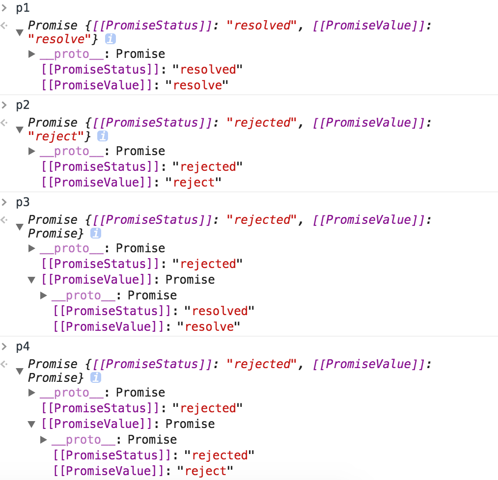 两种方式定义的p1,p2,p3,p4都是相同的,从这段代码可以看出,不论是用那种方式创建promise对象,如果使用Promise.resolve方法传入一个新对象,还是会去‘读取’(可理解为)这个对象的,但是Promise.reject方法传入一个新对象,并不会去‘读取’这个对象,而会直接返回这个这个对象。(这个‘读取’的概念并不是promise中的概念,只是我的个人理解,在八段代码彻底掌握 Promise 这篇文章中,作者把他解释为‘拆箱’,也是作者的一种让人理解起来更简单的思路,至于promise官方文档中的规定,目前还没有去仔细深入研究,有时间会去看一下^-^)
