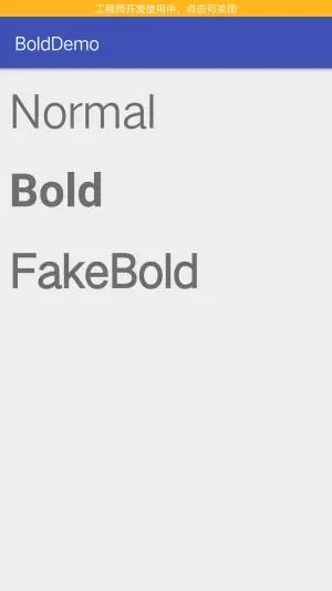 //没错,就几行代码这么简单 public class FakeBoldSpan extends CharacterStyle { @Override public void updateDrawState(TextPaint tp) { tp.setFakeBoldText(true);//一种伪粗体效果,比原字体加粗的效果弱一点 // tp.setStyle(Paint.Style.FILL_AND_STROKE); // tp.setColor(Color.RED);//字体颜色 // tp.setStrokeWidth(10);//控制字体加粗的程度 } } //使用: fakeBoldText.setText(new Spanny().append("FakeBold",new FakeBoldSpan()));如图,依次是普通字体,加粗字体,比较纤细的那种粗——