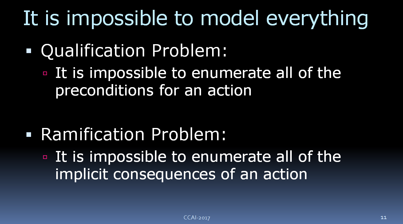 - 其一是先验条件问题(qualification problems),我们无法把某个行动所有的先决条件全都数字化。比如说一辆车要起步,那么燃料、电池、车钥匙就要考虑在内,但还有其他的条件我们可能就忘记了,此类我们所无法完整考虑的先决条件是无穷无尽的。