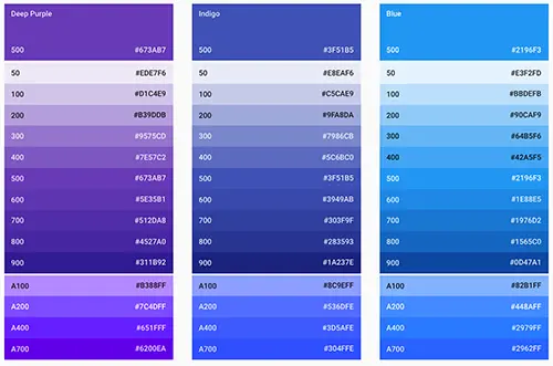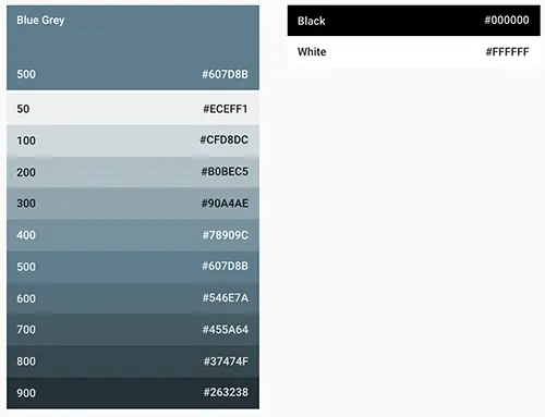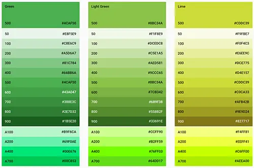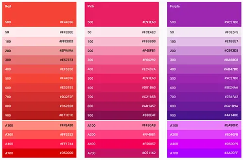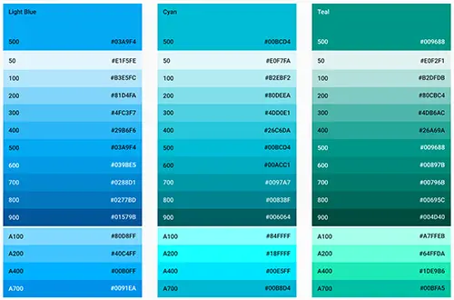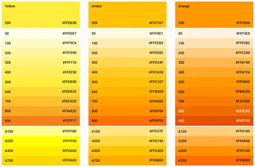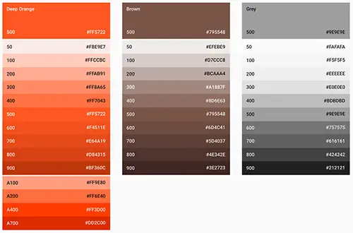 调色板包括主色(Primary color)、强调色(Accent color)。调色板可以用于插画或品牌颜色。它能够帮助你配合其他人的工作。调色板以主色为基准,通过填充spectrum(光谱)形成一套完整可用的颜色。Google建议用“500”作为主色,其它的颜色作为强调色。