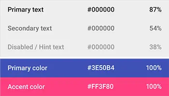 要了解有关颜色、对比度和可访问性(无障碍)设计的详细信息,请阅读 Material Design的可访问性/无障碍 。