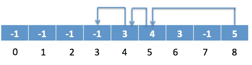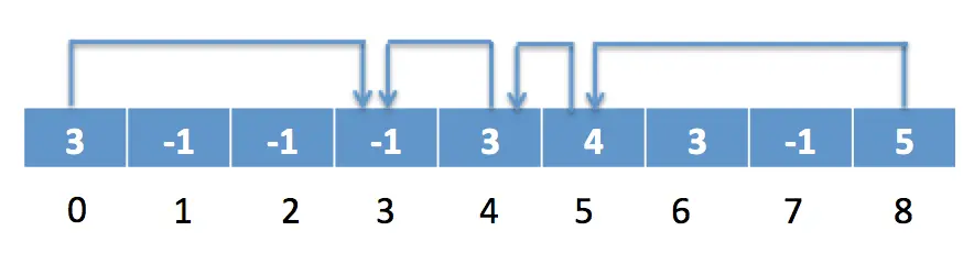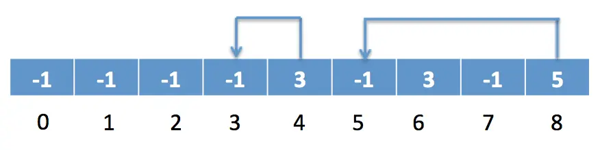 那这个连通集应该怎么表示呢?我们用一个一维数组来表示不同的已连通的集合,初始化的时候每个格子的值都为-1,如下图所示,假设迷宫为3 * 3,即有9个格子: