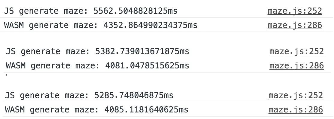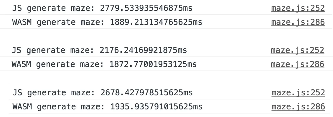 可以看到,WASM的时间大概快了25%,并且有时候会观察到WASM的时间甚至要比JS的时间要长,这时因为算法是随机的,有时候拆掉的墙可能会比较多,所以偏差会比较大。但是大部份情况下的25%还是可信的,因为如果把随机选取的墙保存起来,然后让JS和WASM用同样的数据,这个时间差就会固定在25%,如下图所示: