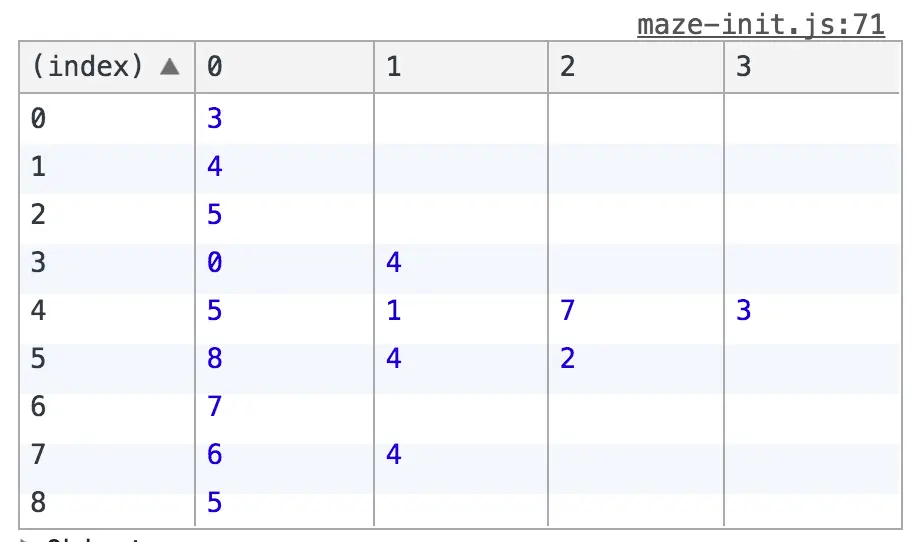 }Maze构造函数传三个参数,前两个是迷宫的列数和行数,最后一个是canvas元素。在构造函数里面初始化一个连通集,作为这个Maze的核心模型,还初始化了一个linkedMap,用来存放拆掉的墙,进而提供给canvas绘图。