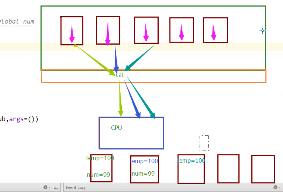 首次定义一个全局变量num=100,然后开辟了100个子线程,但是Python的那把GIL锁限制了同一时刻只能有一个线程使用cpu,所以这100个线程是处于抢这把锁的状态,谁抢到了,谁就可以运行自己的代码。在最开始的情况下,每个线程抢到cpu,马上执行了对全局变量减一的操作,所以不会出现问题。但是我们改动后,在全局变量减一之前,让他睡了0.1秒,程序睡着了,cpu可不能一直等着这个线程,当这个线程处于I/O阻塞的时候,其他线程就又可以抢cpu了,所以其他线程抢到了,开始执行代码,要知道0.1秒对于cpu的运行来说已经很长时间了,这段时间足够让第一个线程还没睡醒的时候,其他线程都抢到过cpu一次了。他们拿到的num都是100,等他们醒来后,执行的操作都是100-1,所以最后结果是99.同样的道理,如果睡的时间短一点,变成0.001,可能情况就是当第91个线程第一次抢到cpu的时候,第一个线程已经睡醒了,并修改了全局变量。所以这第91个线程拿到的全局变量就是99,然后第二个第三个线程陆续醒过来,分别修改了全局变量,所以最后结果就是一个不可知的数了。一张图看懂这个过程