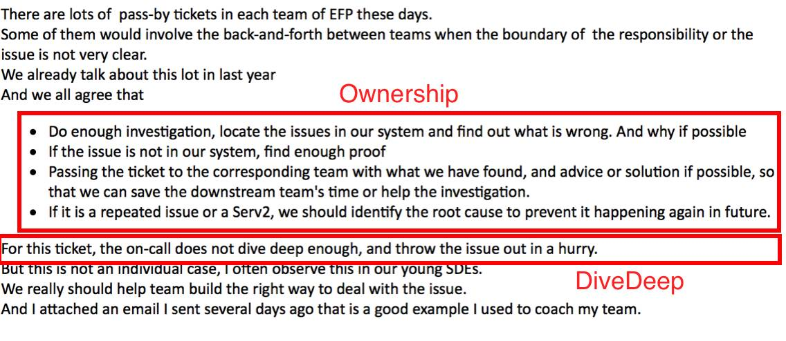 这样比较容易和快速让整个团队建立起服务意识(聚焦客户的结果,业务团队或者内部的依赖团队都应该被当做客户)、勇于担责并且不推诿的做事方式(来自责任感,我们会明确的要求团队不推事,要考虑整个公司或产品的目标,在明确超出范围时,也要说明原因并帮助反映问题),并可以让技术团队自然的关注于业务(深入细节的要求)等等。