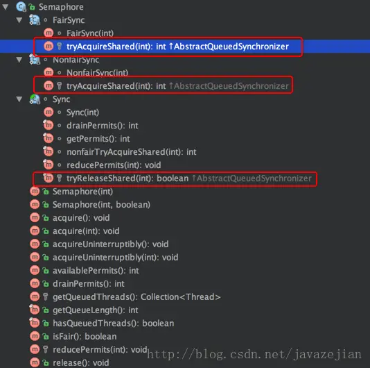 根据类图可知,信号量Semaphore的类结构与上一篇中分析的ReetrantLock的类结构几乎如出一辙。Semaphore内部同样存在继承自AQS的内部类Sync以及继承自Sync的公平锁(FairSync)和非公平锁(NofairSync),从这点也足以说明Semaphore的内部实现原理也是基于AQS并发组件的,在上一篇文章中,我们提到过,AQS是基础组件,只负责核心并发操作,如加入或维护同步队列,控制同步状态,等,而具体的加锁和解锁操作交由子类完成,因此子类Semaphore共享锁的获取与释放需要自己实现,这两个方法分别是获取锁的tryAcquireShared(int arg)方法和释放锁的tryReleaseShared(int arg)方法,这点从Semaphore的内部结构完全可以看出来