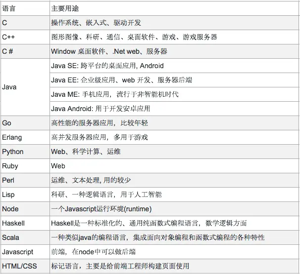 最后我为初学者整理了一个流行编程语言和用途的表: