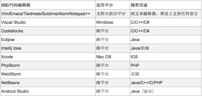 另外还需要注意的是开发工具,可以选用IDE和有代码提示的编辑器,但尽量不要在这上喋喋不休,这就像用来盛放你锋利兵器的架子,用着顺手就行,也不推荐使用纯文本编辑器,这看起来像赤手空拳。 推荐一些编辑器和IDE