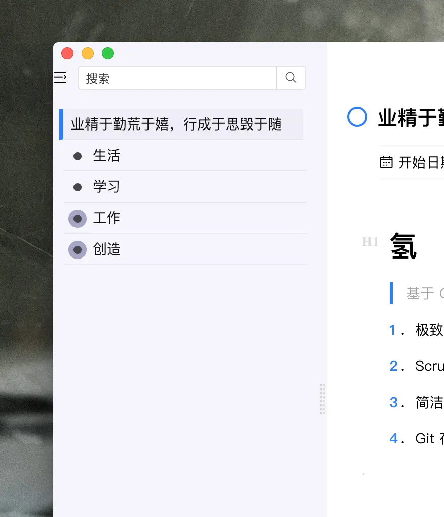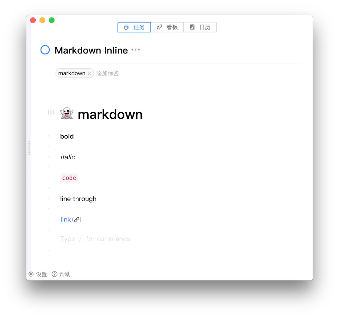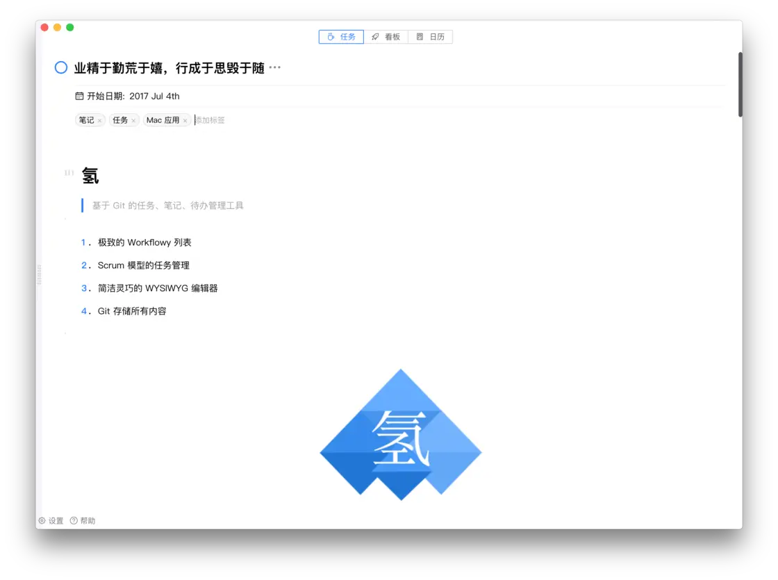 3. 笔记属性,「氢」中的很大一部分工作是要打造一款同样极致简单的笔记工具,任何一条任务都可以当做一个笔记,所以「氢」的笔记设计参考了很多很棒的工具,如 Bear,Notion.so ,但基本的思路是做一个让用户专注于思考的表达的编辑器,而不是一款富文本,提供快捷的如 Markdown 快捷键,Slash Tool , Inline Toolbar 这些工具可以做基本的样式设置, 同时在能力上也提供了很大的扩展空间,这个设计参考 Notion.so,任何东西都是一个 block,可以很快自定义一个新类型的 block,但是又不同于 Notion.so,不会有过多的拖拽排版功能(至少我目前认为这些事表达内容的障碍)。