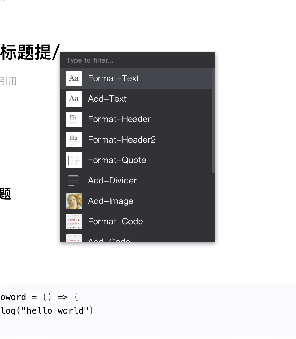 同时支持 notion.so 类似的 / 工具 👽 ,任何位置输入 / 都会出现这个东西,于是可以很方便的插入 block*,或者做 format。