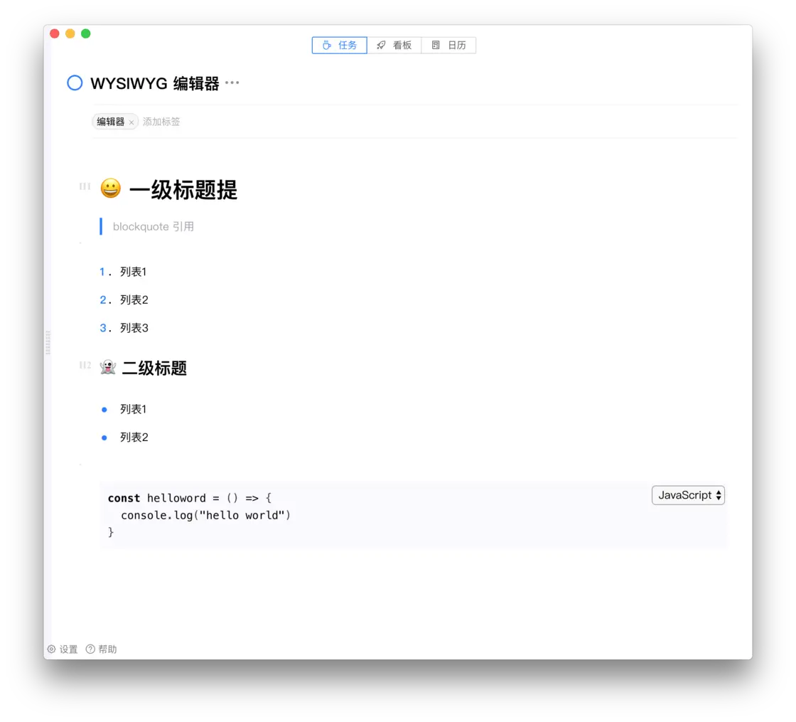 任务详情可以担当完整的笔记书写工具,在书写工具的设计支持如下的一些 block 组件。