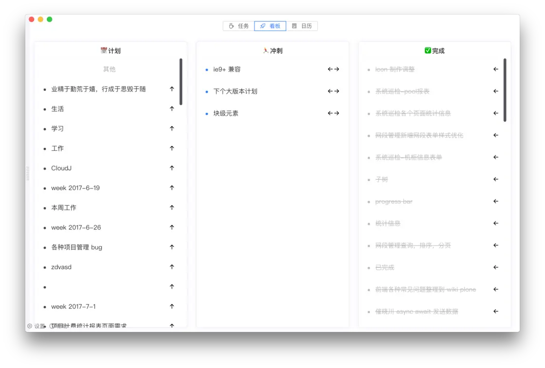 如上,看板部分的设计师参考的 scrum 模型的 backlog - sprint - product,目前这个模式很适用于自己的项目管理。
