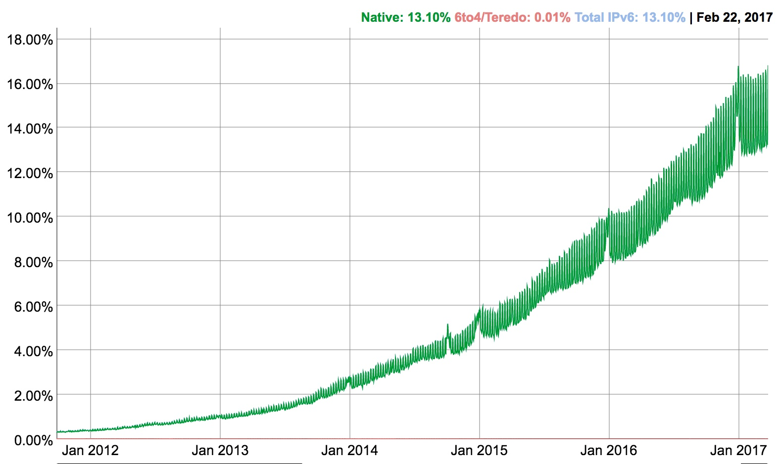 Google所展示的数据是基于使用IPv6访问Google网站而统计出来的。从图中可以看到,从2012年到2017年,IPv6的采用率一直呈现出稳步增长得趋势。从2012年6月份的0.64%到2017年3月份的16.74%,翻了25倍之多。