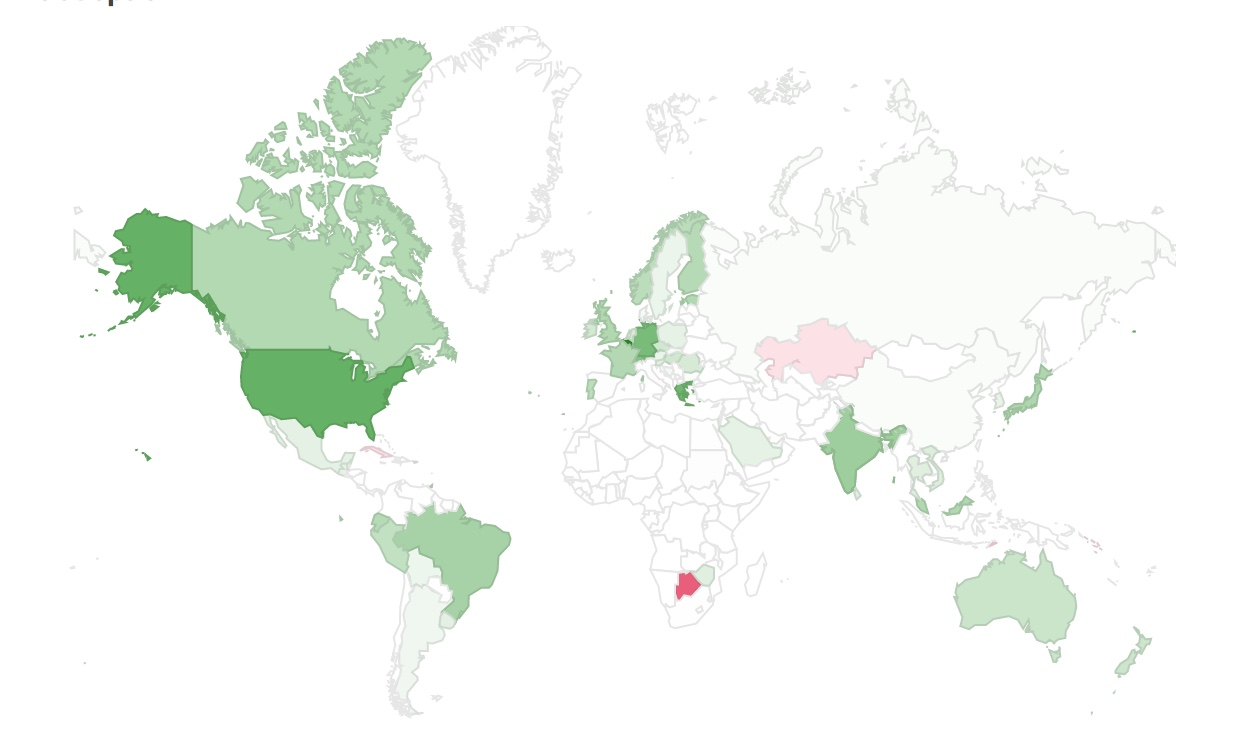 上面这组数字是全球IPv6采用率的一个整体情况,下面再来看看各个国家的IPv6采用率情况。下图是一张世界地图,图中的绿色部分表示部署了IPv6的国家,颜色越深表示部署的比例越大。而红色部分则表示没有部署IPv6或者虽然部署了IPv6但存在严重的稳定性和延迟问题。