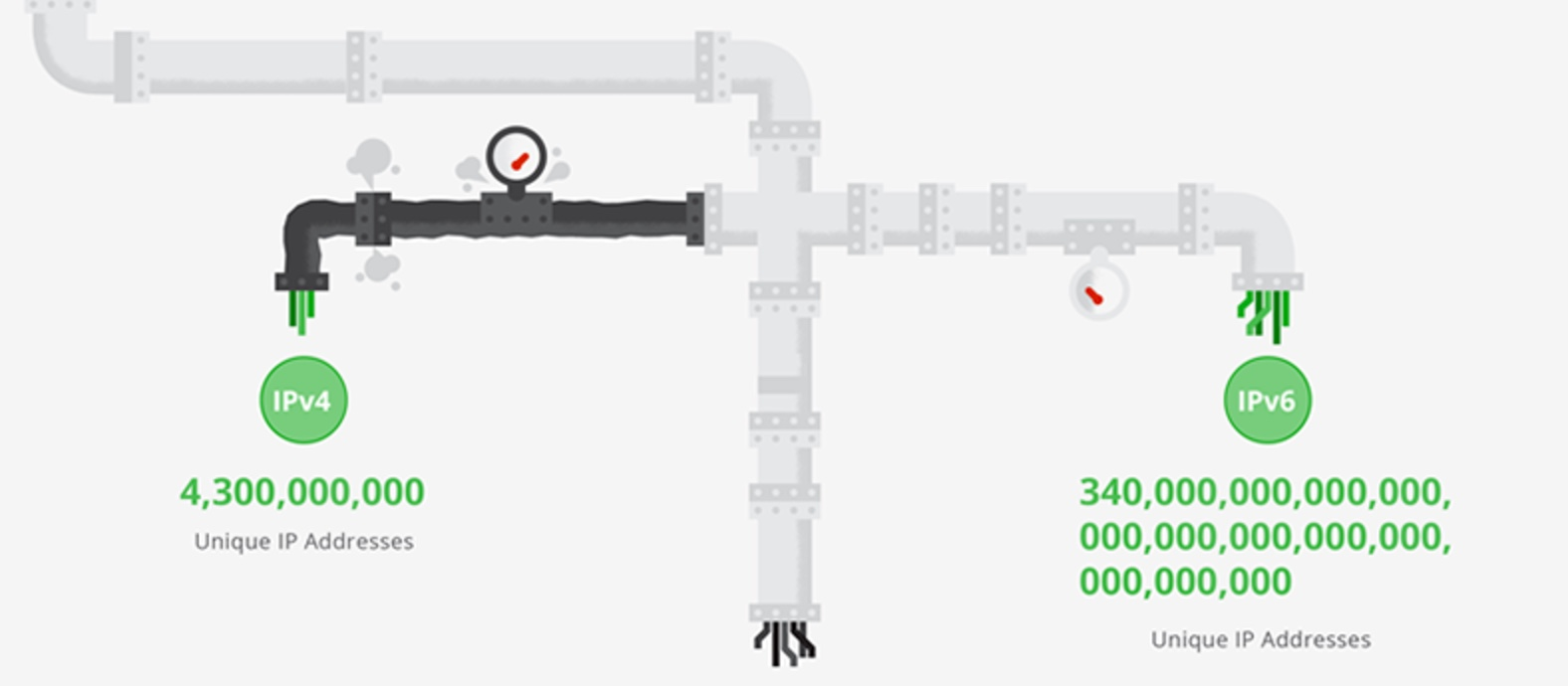 就像每个手机都需要一个号码一样,每一个接入互联网的设备都需要一个IP地址。IPv4只能提供43亿个地址,而全球人口超过60亿,人均都分不到一个IP地址。而随着智能硬件的不断发展,越来越多的硬件需要接入互联网。电脑、手机、电视、穿戴设备、汽车、冰箱、空调,等等,这让原先人均不足一个IP地址的IPv4已经无法满足需求。而IPv6可以提供的地址为340,000,000,000,000,000,000,000,000,000,000,000,000(34后面37个0)个,这么多地址足够全球用户用上几辈子。