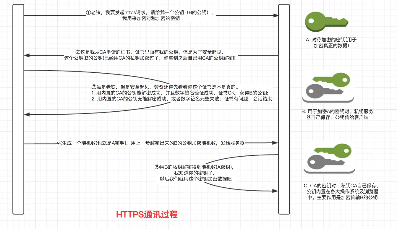 对于第二个问题,这是导致整个https通信过程很复杂的根本原因。如果A或B直接把他们之间用于解密的密钥通过互联网传输给对方,那一旦密钥被第三者劫持,第三者就能正确解密A,B之间的通信数据。