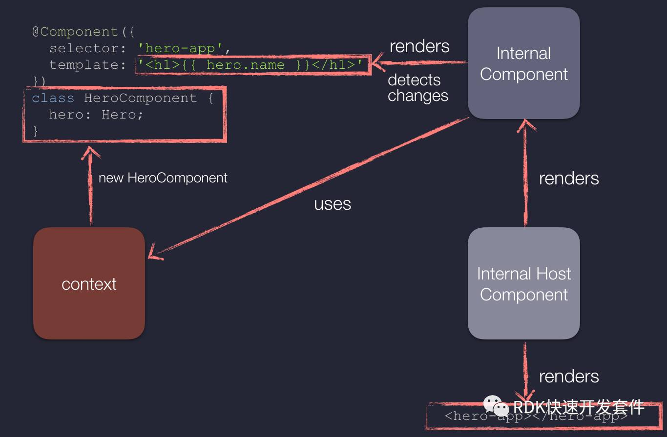 this.context 就是 new HeroComponent(),这意味着如果在 detectChangesInternal 中我们需要访问 this.context.name 的话,就带来了一个问题:如果我们使用AoT模式编译组件的模板,由于这个模式会生成TypeScript代码,因此我们要确保在组件的模板中只访问 this.context 中的public成员。这是为何?由于TypeScript的类属性有访问控制,强制类外部只能访问类(及其父类)中的public成员,因此在internal component内部我们无法访问