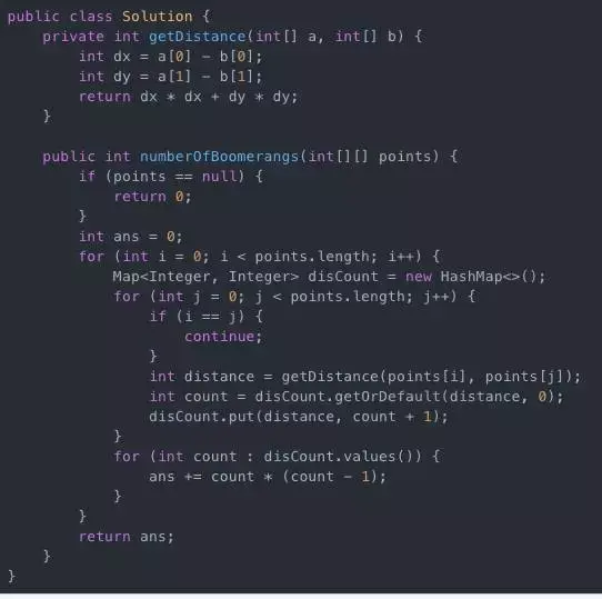 b. 对于一个点A来说,如果有k个点到A的距离相等,那么就可以形成k*(k-1)个回旋镖(在k个点中任意选取两个不同的点均可以和A形成回旋镖,且不同的顺序算不同的方案)。