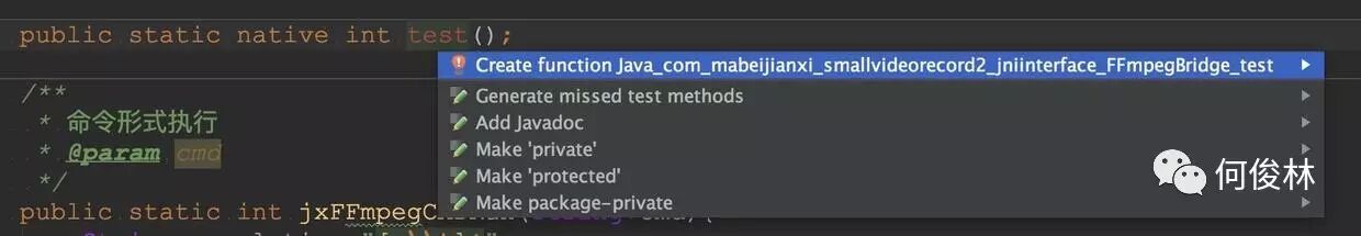 我新建了一个接口类FFmpegBridge.java,且根据我的需求暂时定义了如下方法: