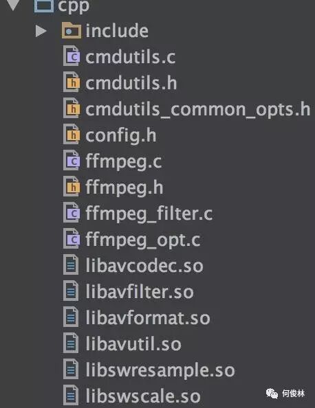 然后我们把在编译Android下可用的FFmpeg(包含libx264与libfdk-aac)中编译好的六个动态库、头文件还有 cmdutils.c cmdutils.h cmdutils_common_opts.h config.h ffmpeg.c ffmpeg.h ffmpeg_filter.c ffmpeg_opt.c copy到我们工程的 cpp目录下,完成后你cpp目录应该如下