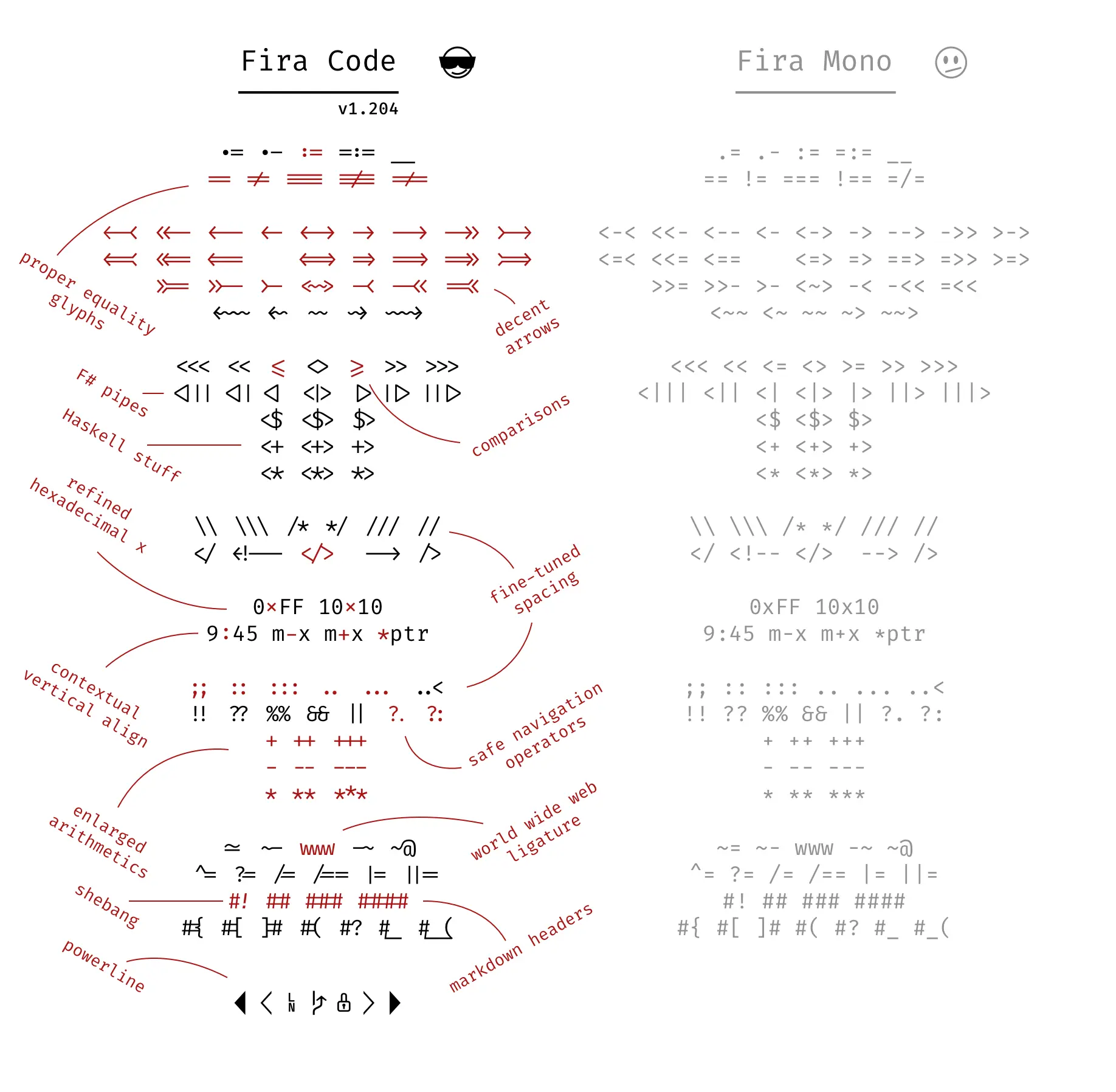 今天看知乎推荐给我一个萌萌哒的字体叫做Fira Code。用了用,感觉还算是不错。其实。它的关注点就是用连字符来提高了语意,如下图: