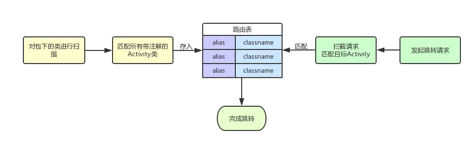 我们的思路很简单,使用注解,为每个activity类标注别名。在启动时对类进行扫描,将带有注解的activity存放路由表中。整个过程被我们封装在ActionManager类中,并对外暴露startAction(String alias ,Bundle data)接口,跳转时通过别名在路由表中进行匹配,完成跳转。大致流程如下: