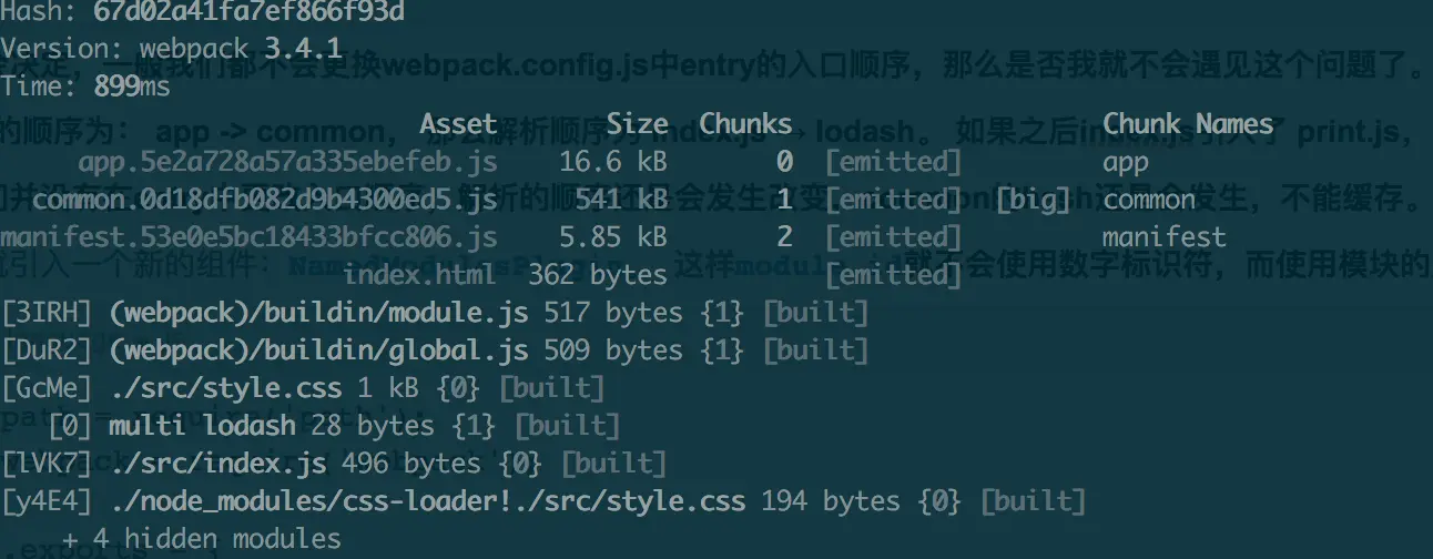 这里发现对比上一张图片发现,common的hash值又发生改变了!!而且根本没有更改index.js的内容app的hash也变了,只是换了一下顺序而已!