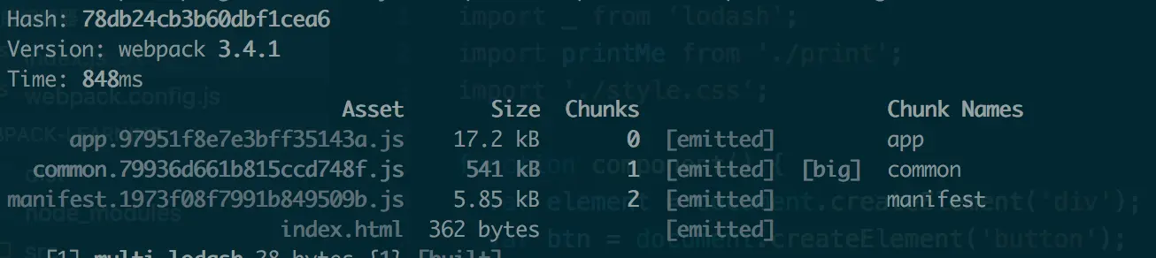结果:index.js打包为app.[hash].js,index.js引入的lodash打包为common.[hash].js。这样解决了浏览器缓存问题和实现了静态资源代码和源代码的分离,但是新的问题又出现了。