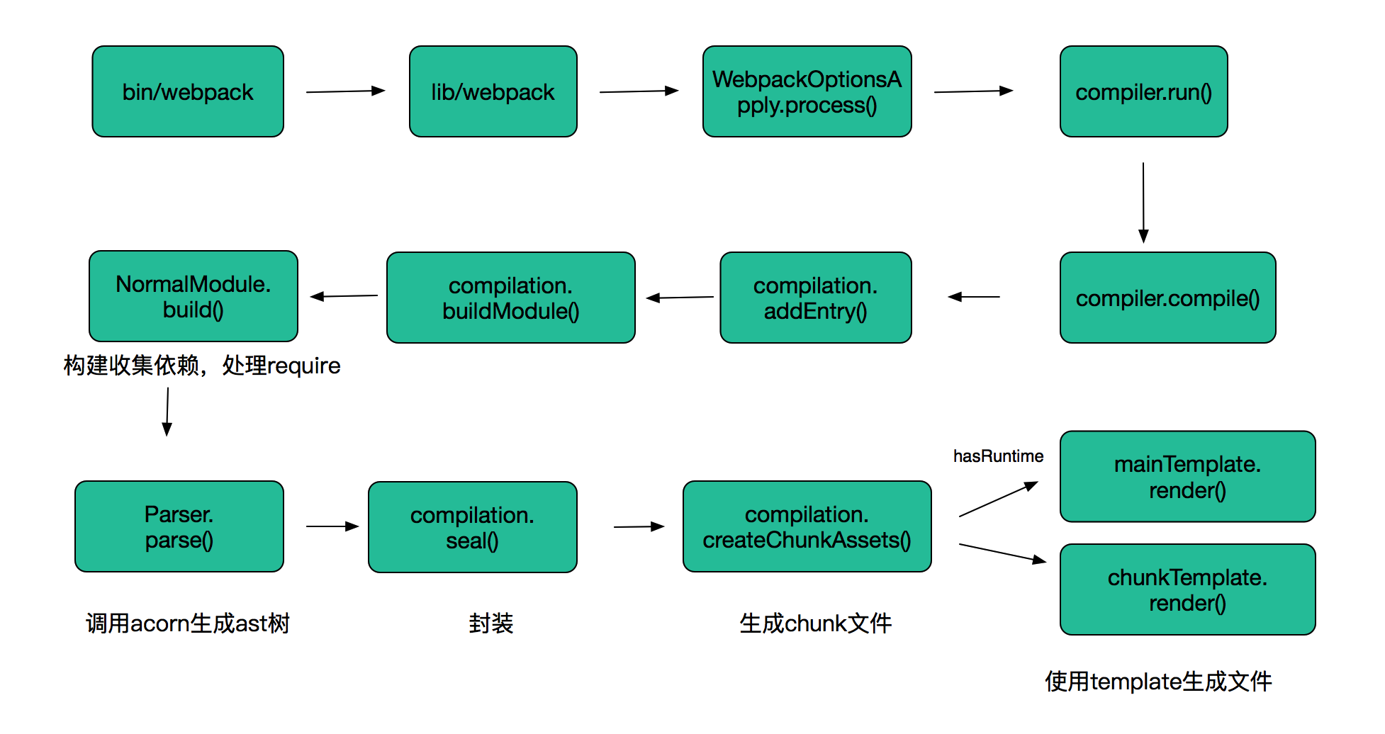 Compilation中做了很多事情,处理编译过程。所对应的方法,如addEntry ,buildModule,processModuleDependencies,createChunkAssets,seal等