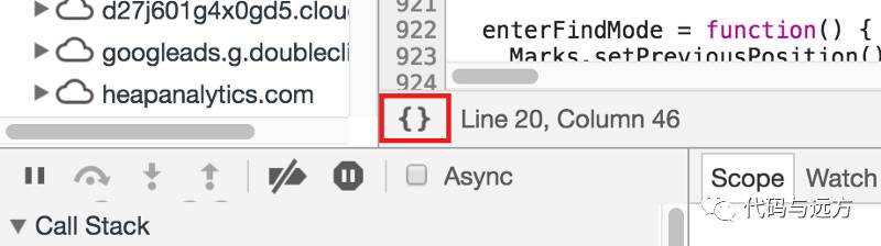 在“Source”的标签栏打开了一个压缩的文档后,你可以点击左下角的花括号logo,之后调试工具就会将代码进行格式化处理。