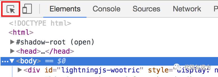 该功能通过点击调试面板左上角的按钮开启(或者通过组合键 ctrl + shift + c), 该模式下你只需单击页面上的元素就可以选中它。