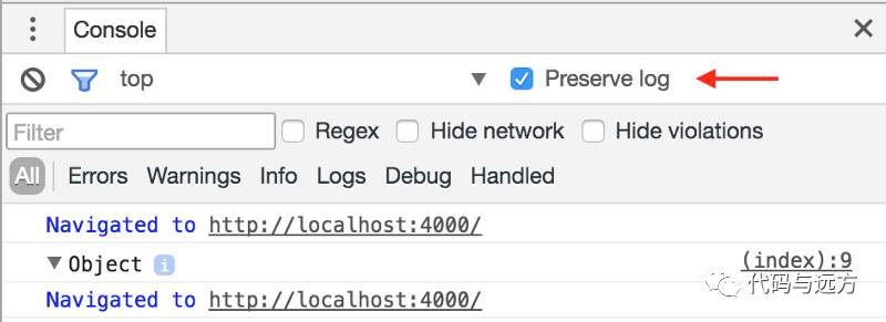 启用此选项后,控制台中会出现一个新的“导航”日志,它指向了刷新或是导航到的页面。