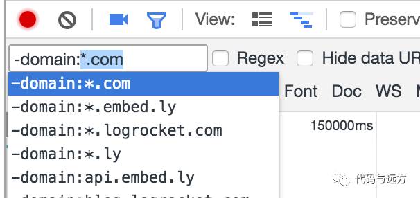 如果你输入了“-”,Chrome会出现一个包含了可选过滤选项的提示框。你也可以打开“正则模式”来对每一行的数据进行正则匹配。