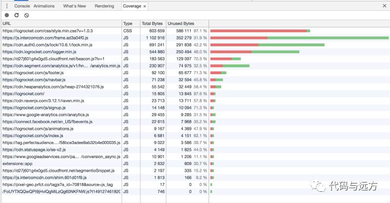 代码覆盖率可以在运行Web应用程序后针对每个JavaScript和CSS文件,查看哪些代码行运行了,哪些代码没有运行。这是很有用的,因为在处理复杂或长期项目时,很容易在项目中累积无用的代码。