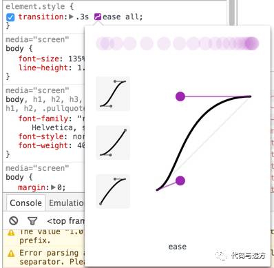 通过点击一个元素 transition 属性中的紫色曲线图表按钮,你可以看到动画的移动曲线,并且微调他的属性。此外,你还可以使用一些预置的时间曲线来应用到你的元素上。