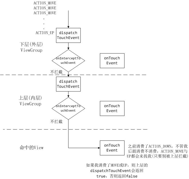 dispatchTouchEvent()返回true,后续事件(ACTION_MOVE、ACTION_UP)会再传递,如果返回false,dispatchTouchEvent()就接收不到ACTION_UP、ACTION_MOVE。