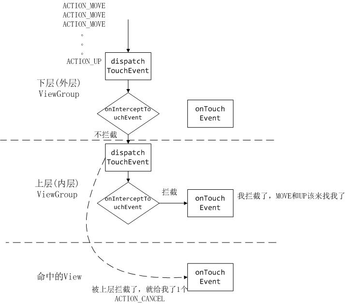 事件由父 View(ViewGroup)传递给子 View,ViewGroup 可以通过 onInterceptTouchEvent()对事件做拦截,停止其往下传递。
