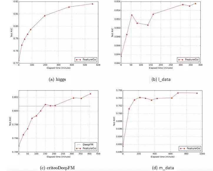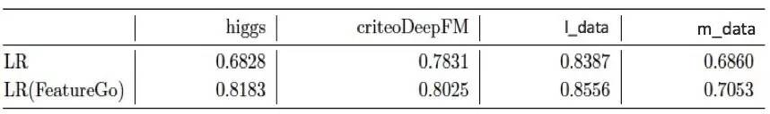 在这四个数据集上,我们使用FeatureGO产生的特征集合加上LR模型进行训练,使用AUC作为评估标准。实验效果如下。可以看到,使用了FeatureGO进行特征工程,在4个数据集上的效果都有非常明显的提升,大部分提升在AUC 2个百分点左右。