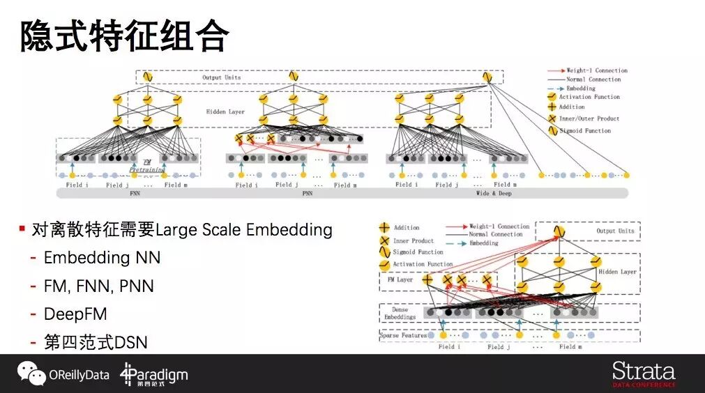 Large Scale Embedding在现在依然是一个比较热门的研究领域,其中的成果包括Discrete Factorization Machine,FNN, PNN, DeepFM等,上图显示了这些算法的异同, 简单来讲这些模型既能找到特征之间的推理关系,同时也能去记忆比较细的特征。在这个领域,第四范式提出了DSN(Deep Sparse Network)的算法,它是一个非常宽且深的模型,里面同样会做大规模Embedding,用神经网络做自动学习组合,目标解决高维模型(上万万亿VC维度)的正则化以及并行计算问题。