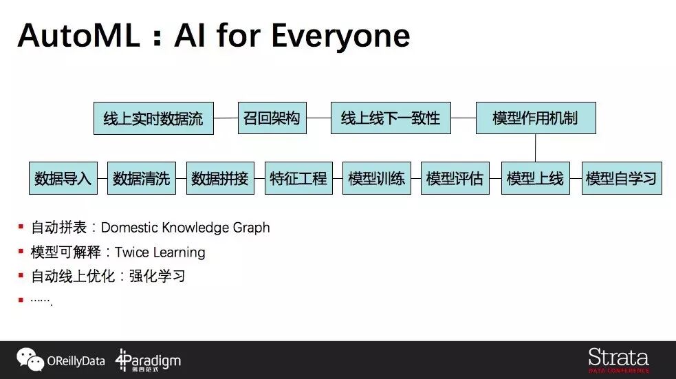人工智能落地的关键:提高AI的易用性人工智能目前还远没有达到可以遍地开花的程度,即使解决了刚才讲的宽与深的问题,我们依然还有很多事情要做。如何训练出好的模型、如何去选择好的参数、如何进行特征组合,都不是一件容易的事情。
