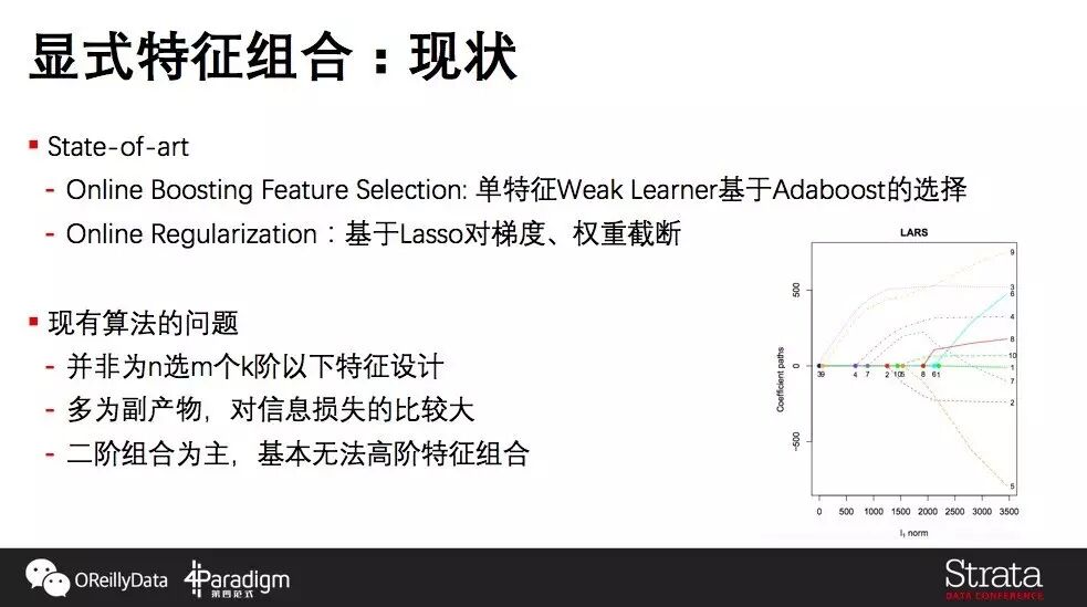 沿着特征走主要是由工业界来主导,比如说谷歌的Adwords里面有上千亿的特征,想要描述为什么会产生一次广告点击,这就需要解决高效并行的问题。这些技术大部分进展来自于KDD或是WWW。沿着特征优化机器学习,就是把问题通过特征的方式分的足够细,做非常准确的模型。